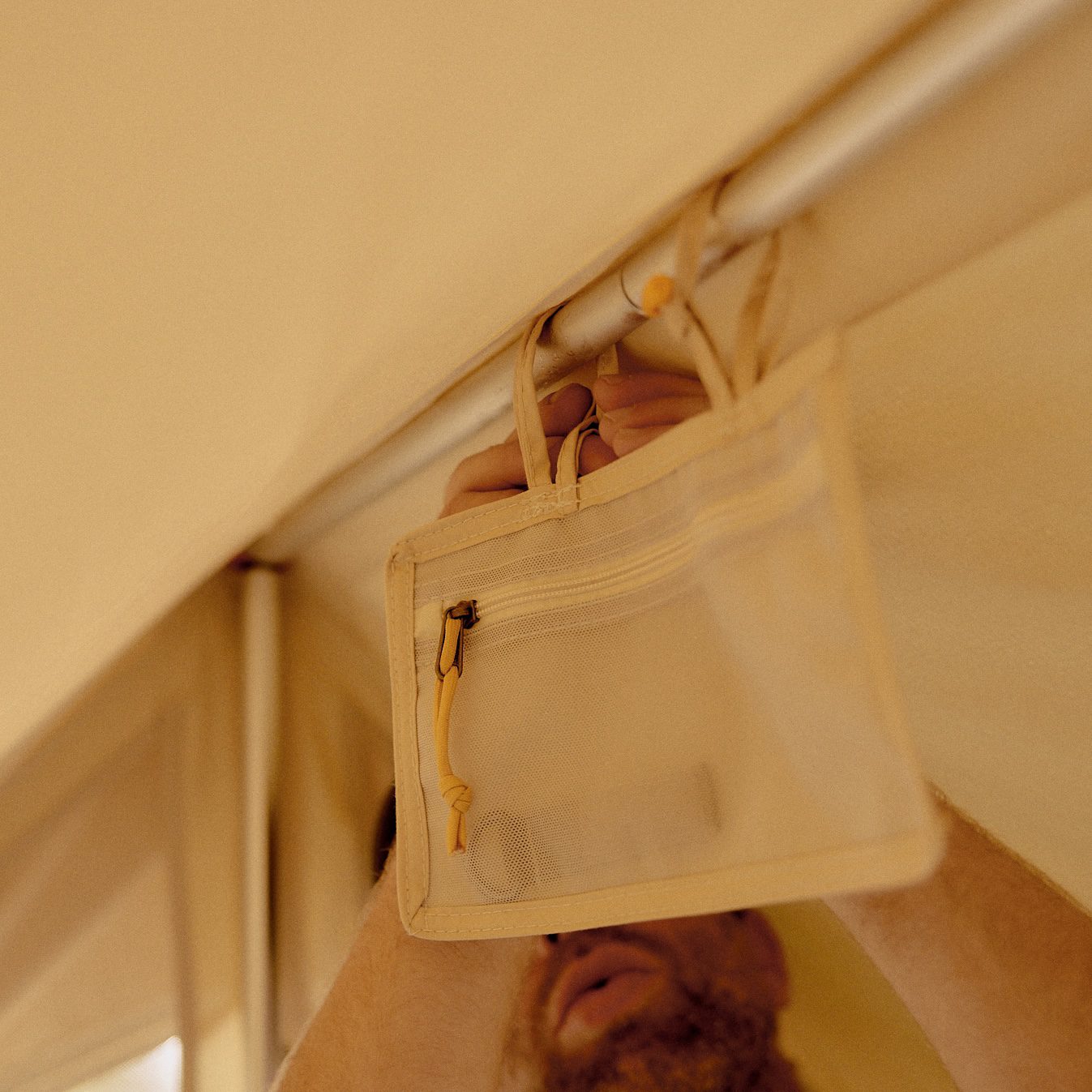 Poles and pegs each have their own bag that packs away snugly into the main tent bag. There is an attachable pocket that can hang from the ridge pole and we have included a separate velcro loop so you can hang a lantern too. There is another pocket for valuables sewn into the seam near one of the doors.