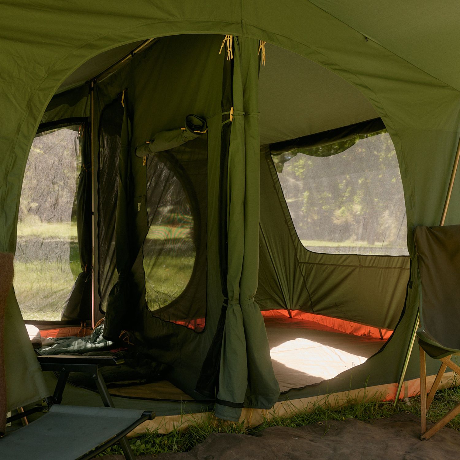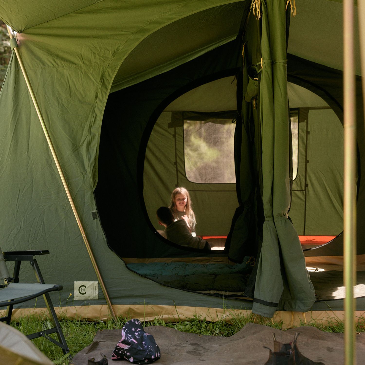 - Signature round double doors – big circular “hobbit house” front and rear doors with separate mesh and canvas layers for extra access and cross-breeze climate control