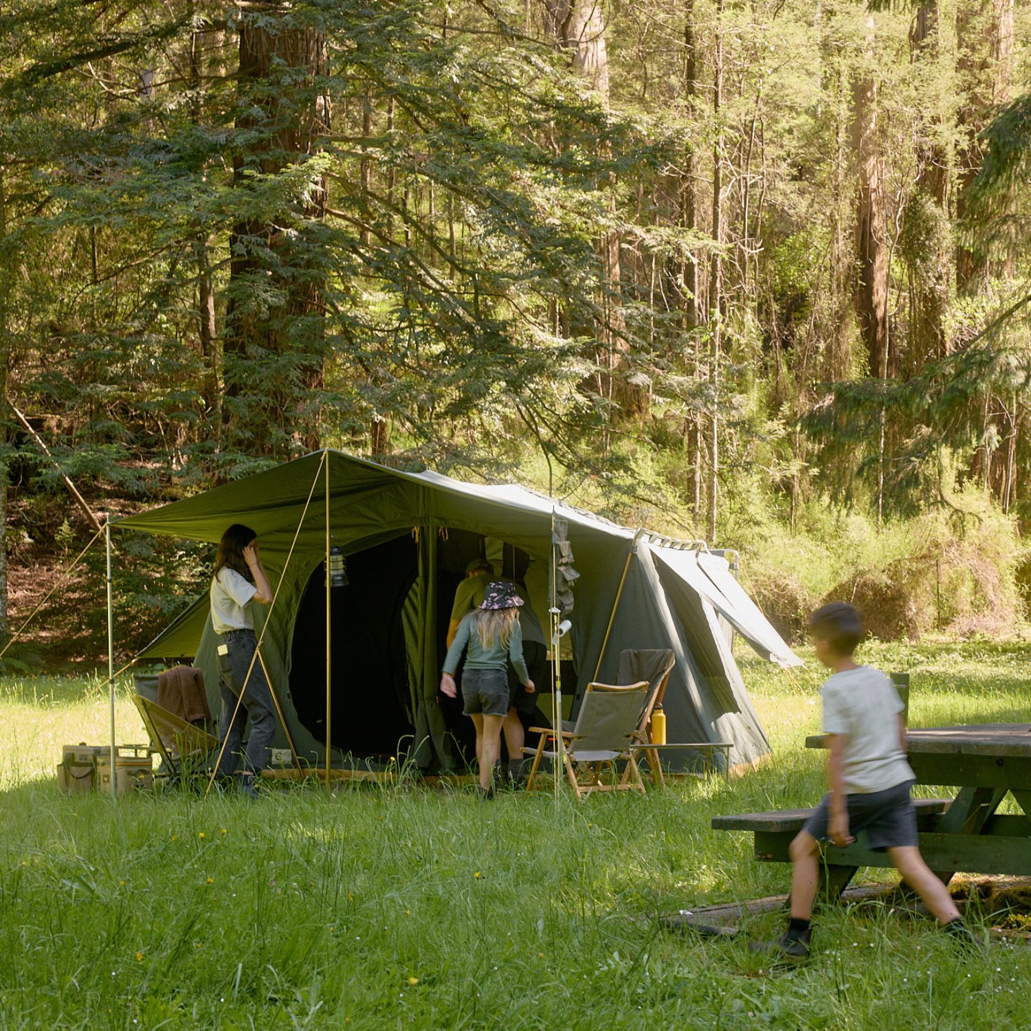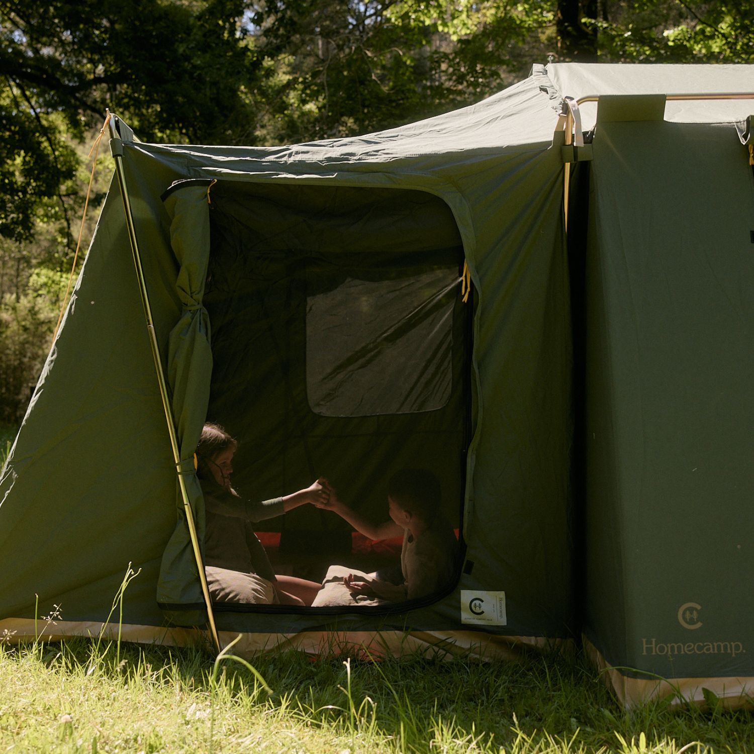 Put it all together and the Homecamp Lodge is a modular canvas camp that can be as simple or as expansive as you like: a solid 4.0m x 2.6m stand-up lodge for couples, a two-three room family set-up with the Room Divider and Rear Annex, and a full canvas basecamp when you add the Mesh Annex and turn the awning into a screened outdoor living room.