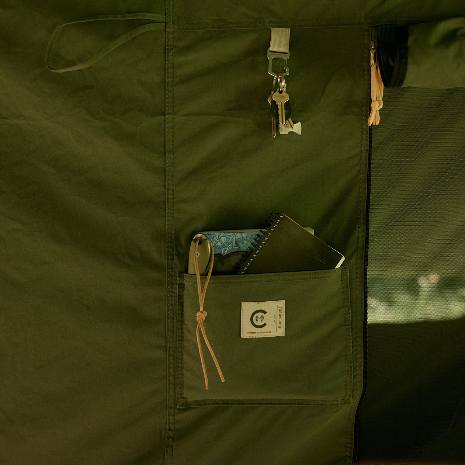 For extra privacy and smarter layouts, you can add the Lodge Room Divider (sold separately). Made from the same 285gsm canvas as the tent, it attaches to the internal poles with simple Velcro tabs, creating two distinct rooms. A trailing canvas skirt at the base helps block draughts and light. In the centre there’s a full-height zip door with both mesh and canvas layers, plus a matching canvas-and-mesh window, so you can control airflow and privacy between the two rooms just like you do with the outer walls. The divider also includes a handy storage pocket and a carabiner key fob to keep phones, headtorches and keys off the floor and easy to find. There’s space for 2–3 single mattresses on one side and a queen or king mattress on the other, turning the Main Lodge into a genuinely functional two-room tent.