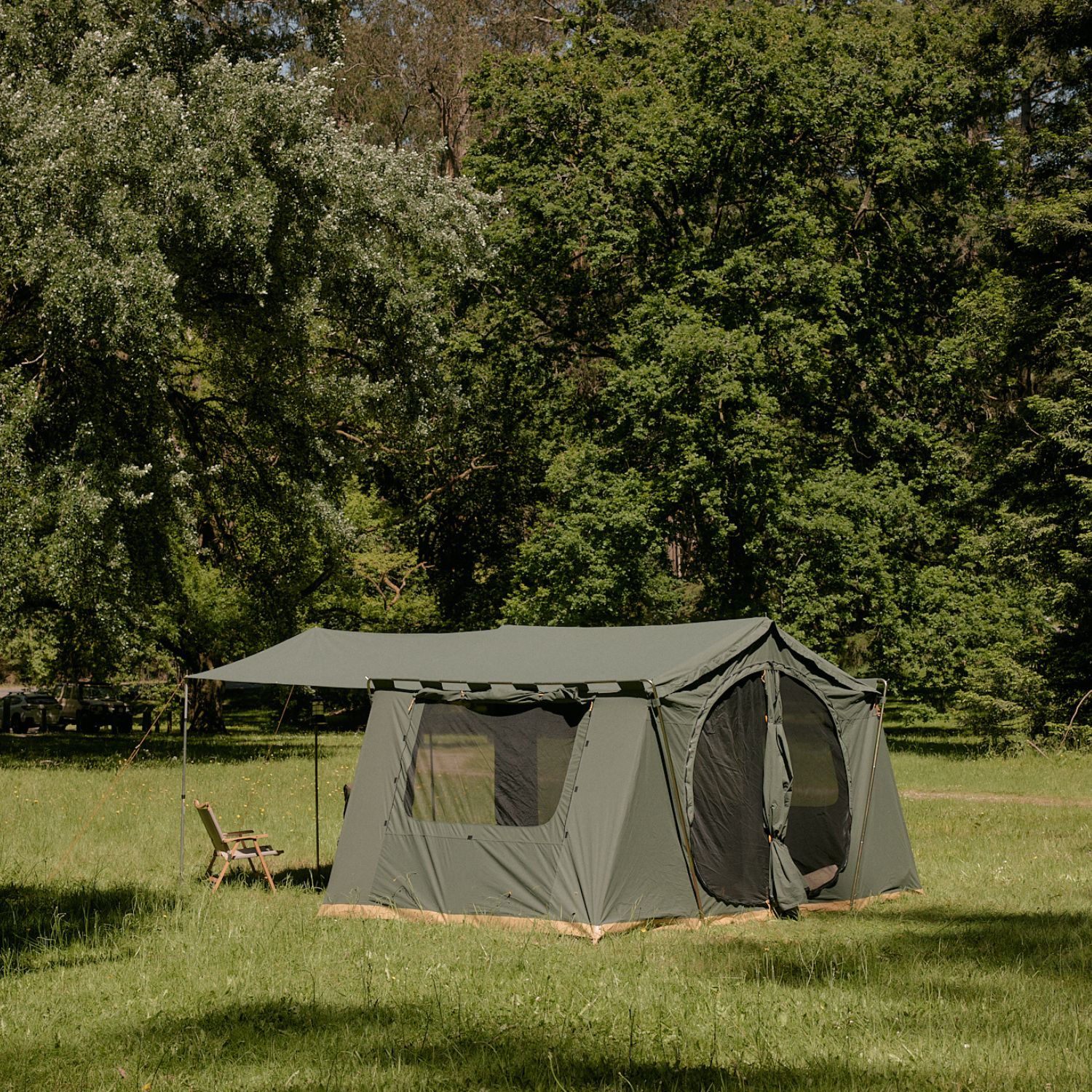 The Lodge is our take on those classic 60s–70s cabin tents – big straight walls, generous headroom and a proper front verandah – rebuilt with modern materials, smarter detailing and a touch of Homecamp magic. It’s designed as a base you can grow into over time: start with the main Lodge, then add sleeping and living modules as your crew (and your gear) expands.