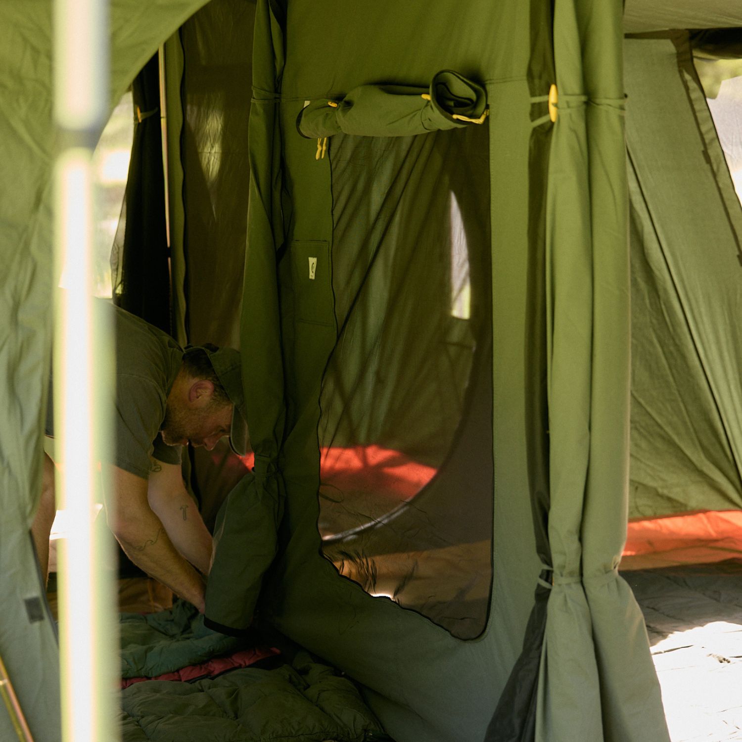 Made from the same 285gsm polycotton canvas as the tent, the divider attaches in seconds using simple Velcro tabs that wrap around the internal poles. A trailing canvas skirt at the base helps block draughts and light, making each side feel more snug and self-contained.