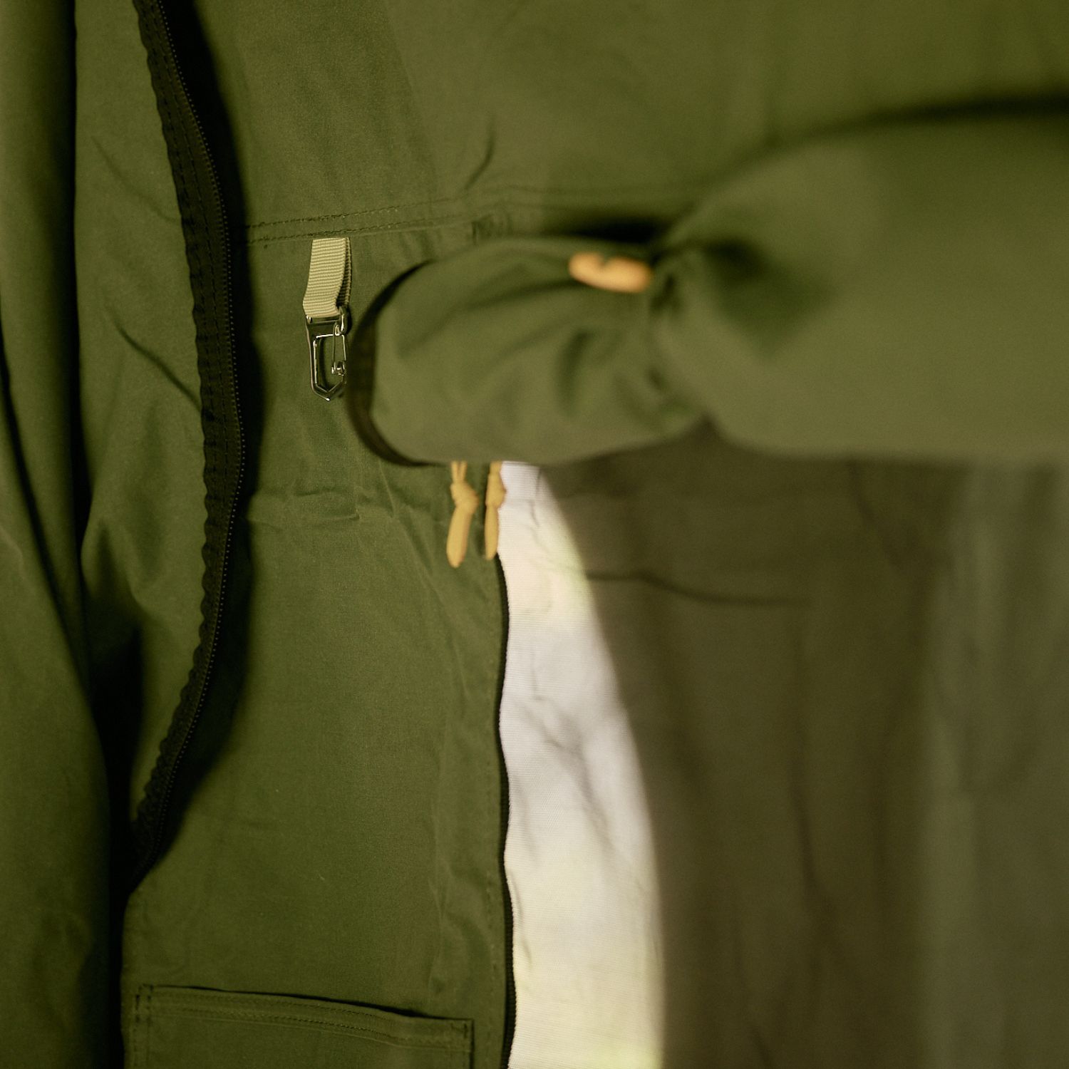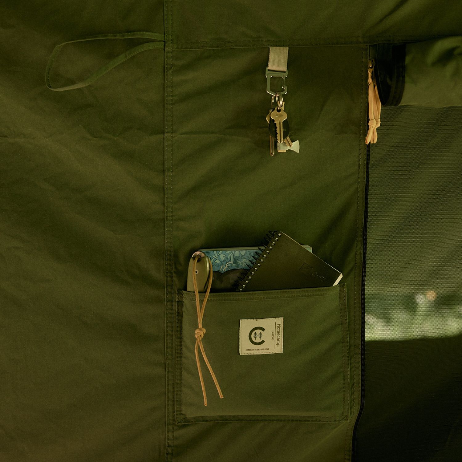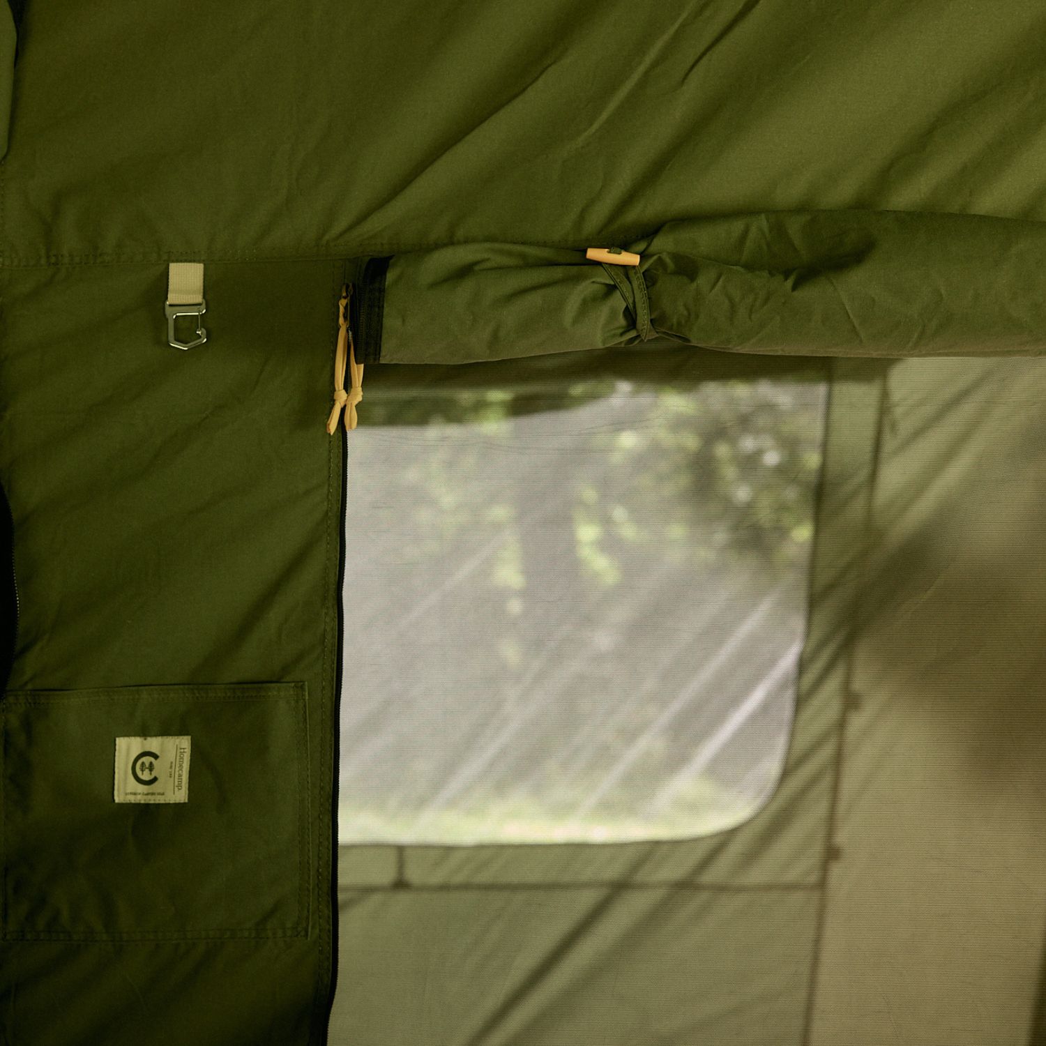 In the centre, there’s a full-height zip door with both mesh and canvas layers, plus a matching mesh-and-canvas window, so you can control airflow and privacy between the two rooms just as you do with the outer walls. On the divider you’ll also find a handy storage pocket and a carabiner key fob – perfect for stashing phones, headtorches and keys where you can actually find them.