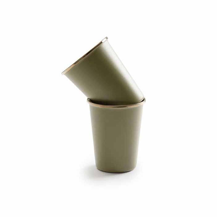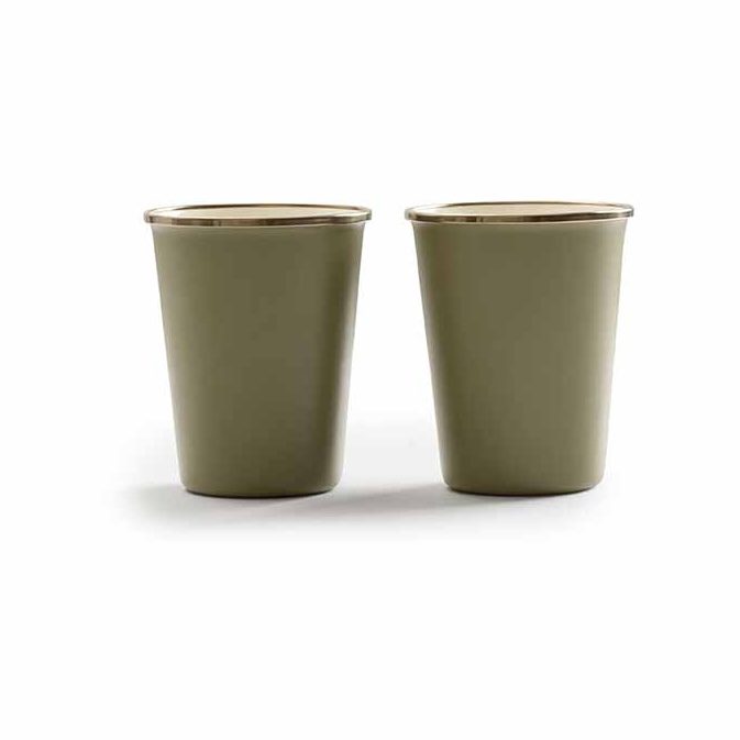 Crafted from a solid steel core with a rust resistant heated glass exterior, this mug set is a durable and stylish addition to your camping collection. featuring a matte olive drab exterior and a contrasting cream interior, finished with a bronze like stainless steel rim. This mug set combines the charm of traditional enamelware with an updated smooth interior that guards against stains, and a textured exterior that allows for a secure grip and durability.